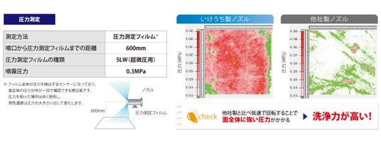 いけうちのプレッシャーオープンノズル『RJ2-PON』は、噴口部が回転・洗浄する際に他社製と比べて低速で回転するという特徴があります。そのため被洗浄物と洗浄水の時間あたり接触量が多くなり、洗浄面全体に比較的強い圧力がかかることで効果的に洗浄することが可能です。