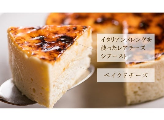 濃厚なチーズケーキはイタリアンメレンゲを使ったシブーストとベイクドチーズケーキの2層になっています。上はふわっとした柔らかな口当たり、下はしっとり濃厚な味わいがゆっくりと口の中に広がります。