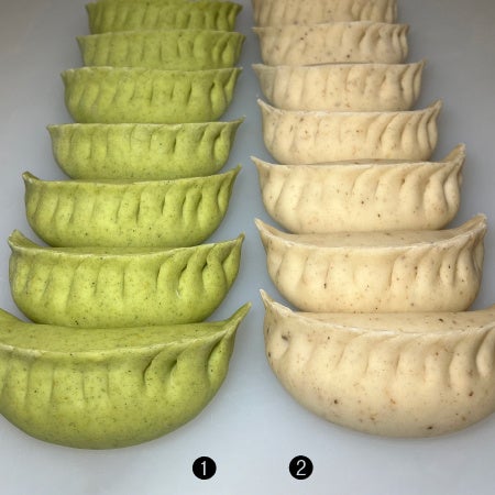 札幌〈山田餃子店〉1.山田家の餃子plus+塩麹と春キャベツ (8個入)税込1,110円2.山田家の餃子plus+三種のチーズと味噌 (8個入)税込1,150円