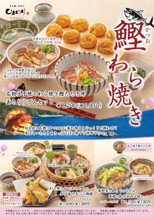香ばしい香りが楽しめるわら焼き鰹のたたきと、春野菜など春が旬の食材を使用した期間限定商品を販売中です。この機会にぜひご賞味ください。