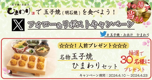 M&Sフードサービス株式会社(本社:大阪府大阪市、代表取締役社長:夏井 克典)が運営する「玉子焼・お出汁 ひまわり」では、当店の”特製お出汁”をたっぷり使用した名物玉子焼、季節で変わるお出汁の効いた炊き込みご飯、お出汁の旨味と天ぷらの相性ピッタリの天ぷらうどんが一番の人気商品の玉子焼和食チェーンです。この度、玉子焼・お出汁ひまわり公式Xアカウントをフォロー&リポストして応募すると、抽選で30名様に「名物玉子焼 ひまわりセット1人前(税込み1,309円)」をお召し上がりいただけるデジタルお食事券プレゼントキャンペーンを、2024年4月10日(水)より開催します。この機会にぜひご応募ください。
