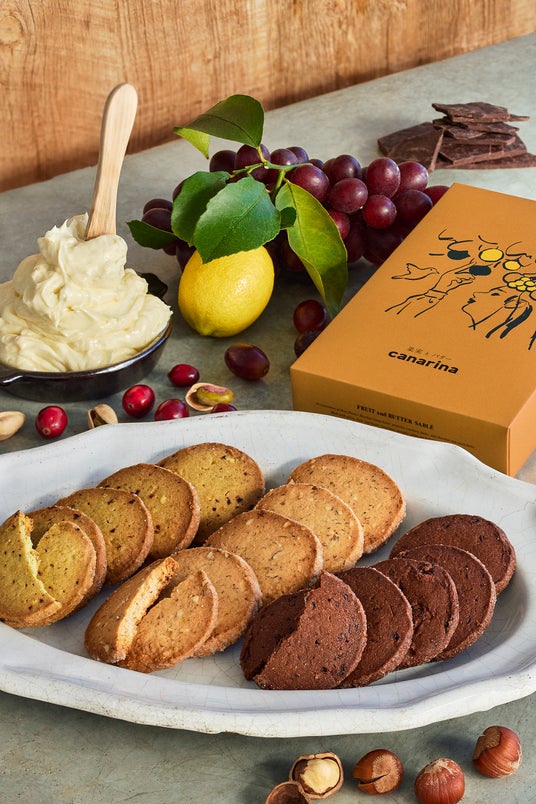 ヘーゼルナッツ シトロンバター・ピスタチオ クランベリーバター・ショコラ ラムレーズンバターの3種類の詰め合わせ。小麦に果実とバターを合わせ、さっくりと焼き上げた、食感や香り・素材を味わう、カナリナこだわりのサブレです。