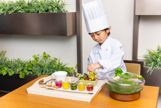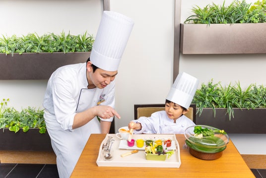 東京野菜などをお子さまご自身でプランターの畑に植える“野菜畑作り” や5種類のソースでドレッシング作りをお楽しみいただけます。ホテルが貸し出すコックコートを着て気分はなりきりシェフに。野菜との新たな出会いや学びから食育につなげます。