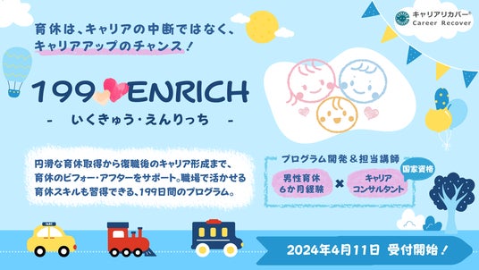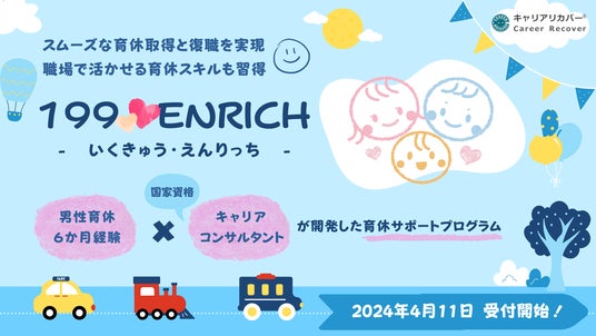 キャリアリカバー(所在地:東京都千代田区 代表:堀 左馬之介)は、育休取得とキャリア形成を全面的にサポートするプログラム「199 Enrich」(イクキュウ・エンリッチ)を、2024年4月11日にリリースします。このプログラムは、男性育休6か月の経験を持つ国家資格キャリアコンサルタントが、育休取得を考えている男女を対象に、育休生活のプランニング、育休の円滑な取得方法、育休中の家庭での過ごし方、復職後のキャリア形成まで、育休前後に起こりうる課題を全面的にサポートするものです。