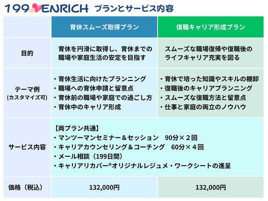 「199 Enrich」は、育休前後の課題に応じて、育休スムーズ取得プランと復職キャリア形成プランの2種類を用意。
