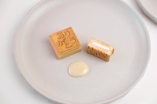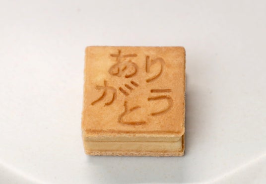 北海道産バター風味のクッキーで、高級バニラビーンズを使用したペーストをサンド。サクッとした食感のあと、とろっとした濃厚な味わいが口の中に広がります。クッキーの表面には、日本語で「ありがとう」という文字が刻まれています。