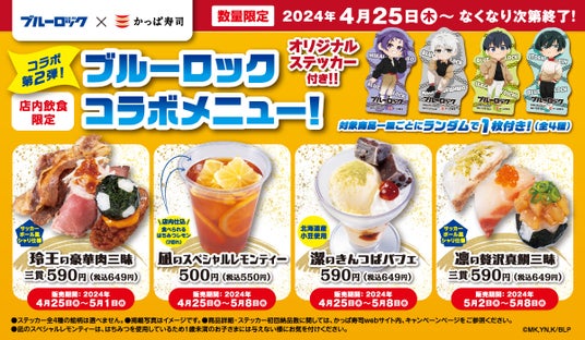 サッカー漫画『ブルーロック』とのコラボレーション第2弾として、2024年4月25日(木)より、かっぱ寿司全店にて、かっぱ寿司限定オリジナルステッカーがセットになったコラボメニュー4品を販売いたします。