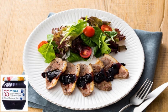 メニュー例:鶏もも肉のママレード煮 かも肉のソテーブルーベリーソースがけ