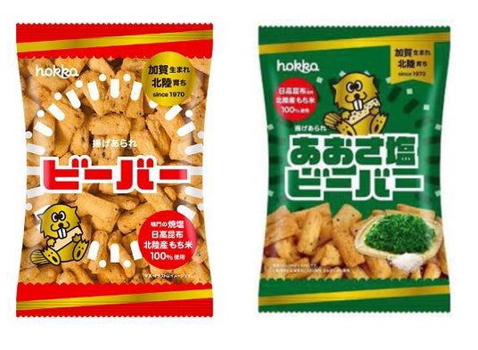 ビーバー各種【石川県民ならだれもが知る!ビーバー】北陸産のもち米に日高昆布を練りこんだ生地を高温で揚げたサクサクのあられに、鳴門塩で味付けされたシンプルなお菓子です。 塩味と昆布の旨味が引き立ってどれだけ食べても飽きない味が魅力!