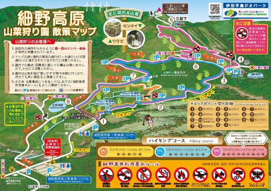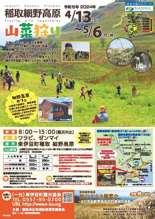 わらび・ぜんまい等の山菜が取り放題。秋には一面すすき野原になる細野高原ですが、総面積125ヘクタールの内の約90ヘクタール(東京ドーム19個分)の広大な高原に自生する山菜は春の伊豆ならではの味覚です。海の幸を堪能した後は、山の幸を自然と触れ合い探してみてはいかがでしょうか?