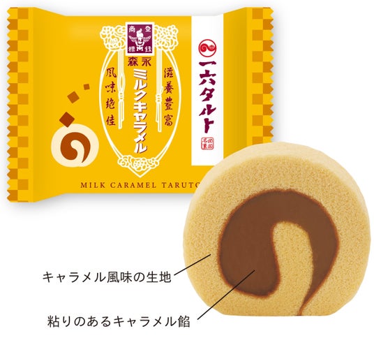 森永製菓監修のもと、「森永ミルクキャラメル」のコクと優しい甘さを表現した一六タルトです。「森永ミルクキャラメル」だとひと目で分かるパッケージは、一六タルトとミルクキャラメルのおいしさをイメージできるデザインとなっています。