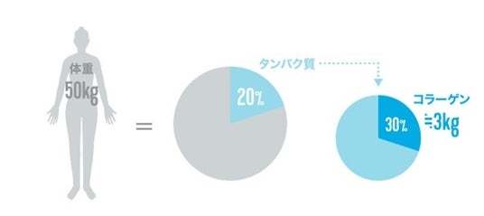 コラーゲンは、からだのあらゆる場所に存在し、からだを構成している大切な成分でありタンパク質の1つです。人間の体重のおよそ20%はタンパク質で出来ていますが、そのうちの3割を占めるのがコラーゲンと言われています。