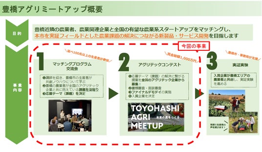豊橋市の農業者等が抱える課題の解決に資する製品・サービスの社会実装を目指し、市内外のスタートアップと本市農業者等が協働で実証開発に取り組む共創プロジェクトを組成するため、以下の取組みを実施します。