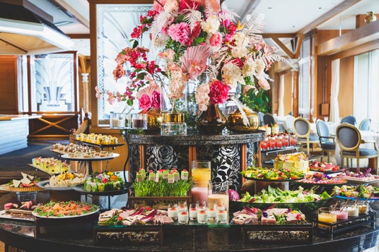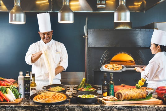 ライブキッチンでシェフが作る料理の数々、石窯ピザ、焼き立てパンなどバラエティに富んだ料理とスイーツが楽しめるブッフェ。