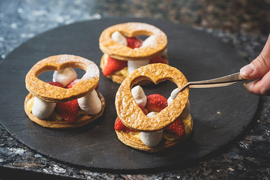 パティシエが目の前で仕上げる濃厚カスタードのイチゴのミルフィーユとなめらかクリームブリュレまで、エレガントな空間で50種類以上のフレンチビュッフェをどうぞ。