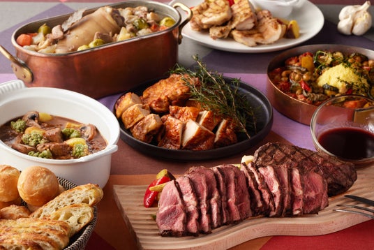 コクのある合鴨を使用した冷製料理「合鴨のスモーク フムスと焼きネギ 照り焼きマデラ」は、トルコの伝統料理・フムスに合鴨のスモーク、芳醇な香りと甘みが味わい深いマデラ風味の照り焼きソースを合わせたアレンジメニューです。日本とトルコの新感覚のコンビネーションをお楽しみください。北アフリカに位置するアルジェリアで国民食として愛されている「仔羊のトマト煮 クスクス添え」は主食として食べられているクスクスに、柔らかく臭みのないことで知られる仔羊のトマト煮込み、彩り野菜、ひよこ豆を添えた鮮やかな一品です。その他、赤ワインでじっくりと煮込んだ濃厚な味わいの「ブルゴーニュ風ビーフシチュー」や、数種類のスパイスで味付けされた食欲をそそる香りを放つ「タンドリーチキン」、希少部位のミスジを使用したステーキなど国ごとに異なる様々な肉料理をご堪能ください。