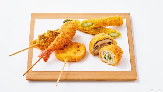 会津白虎隊隊士の眠る飯盛山参道に店舗を構え、会津地鶏、会津産豚、地物野菜など会津の食材を使った串かつを提供する<串鶴>。「会津産生しいたけ肉詰め」や、半熟卵を丸ごと揚げた「ばくだん」の他、定番のエビ串や鶏つくね串など、串鶴おすすめの8種を詰め合わせました。自家製ソースボトル付。