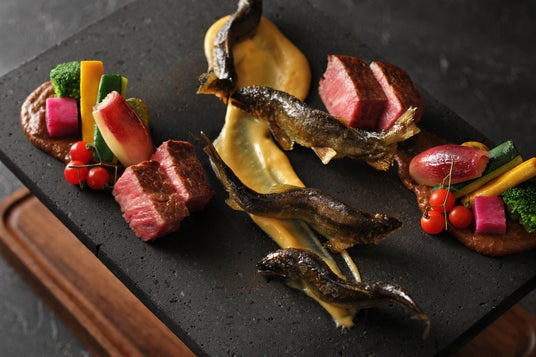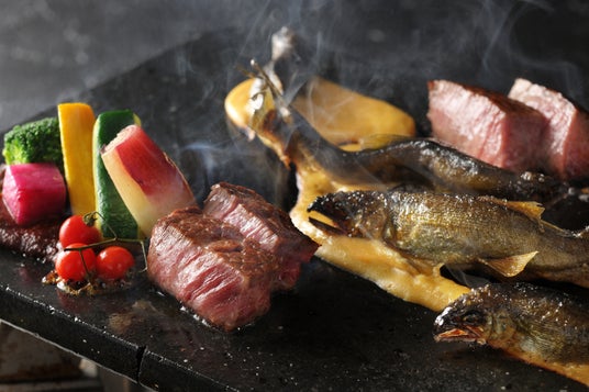 栃木県一部エリアで親しまれてきた河原石の上で調理する「石焼き」から着想を得た調理法で、最後、お客様の目の前で鮎を石焼き調理します。石の上には白玉味噌と赤玉味噌の2種類の味噌をのせ、その上でそれぞれ鮎や牛肉、季節の野菜をのせて焼きます。たちまち立てのぼる味噌の香ばしい香りに食欲をそそられる瞬間です。また、2種類の味噌それぞれに、大豆をすりつぶした「すったて」を混ぜ合わせることで、味噌本来の塩分を抑え、鮎の繊細な味を邪魔しない柔らかな味わいとなります。
