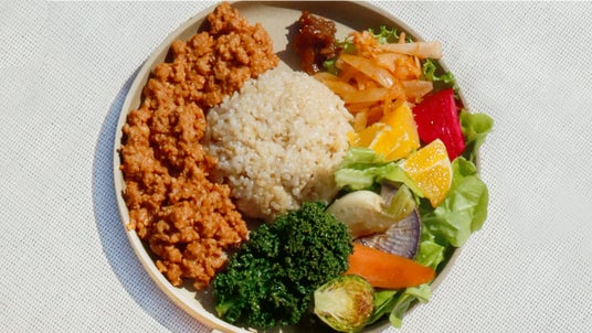 新潟県産特別栽培米コシヒカリ玄米を使用し、農家から仕入れる野菜をふんだんに味わえるヴィーガンの食事メニューです。季節野菜のグリルに素材が際立つ野菜デリとソイミートなど栄養と食べ応え満点の一皿です。