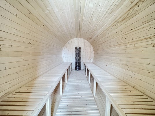 KULTA は、大小5 台ものバレルサウナが並ぶアウトドアサウナです。薪ストーブのバレル2 台と電気ストーブのバレルが3 台、そのうちの1 台は日本には数少ない大型のバレルサウナで、14 人まで入れる大きさ。男女一緒に利用できる水着&ポンチョ着用のサウナです。