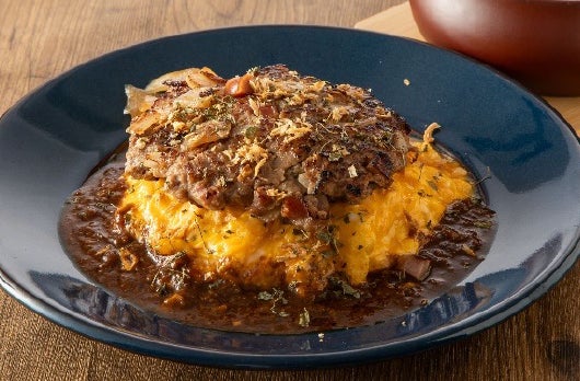 オムレツに「くずし粗挽きハンバーグカレー」を乗せたぜいたくな一品。とろとろの卵は、カレーともハンバーグとも相性抜群です。