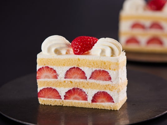 生クリームは乳脂肪分40%以上の2種類をブレンドし、深みのある味わいに。スポンジの味・厚みに合わせて細かく配合を調整し、豊かなコクと風味がありつつもすっきりとした後味をお楽しみいただけます。苺は、季節に合わせて産地・品種を厳選したものを3.5個分使用。さっぱりとした甘酸っぱさの苺をハーフカットにし、しっかりと苺のおいしさを感じられるケーキに仕上げました。