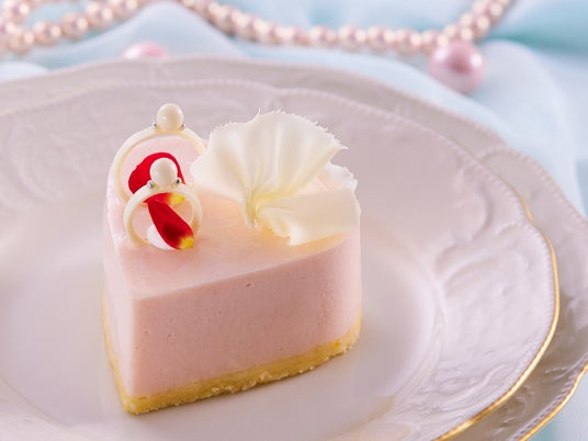 6月の誕生石「パール」をテーマにしたマンスリーケーキ。真珠のペアリングとウエディングドレスのフリルでジューンブライドを表現。ハート形のケーキは、桃とホワイトチョコレートのムースにブルーベリームースとレモンゼリーを入れ、酸味のアクセントが効いたさっぱりとした味わいに仕上げました。誕生日や記念日、結婚祝いにもぴったりな華やかな一品です。