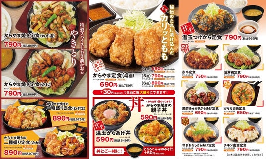 2023年3月、とことん「カリッともも」をお楽しみいただける11種類の定食に加え、独自の調理法で揚げ焼きにすることで香ばしくジューシーな、ご飯のおかずとして楽しめる新感覚のやきとり「からやま焼き」が仲間入り。