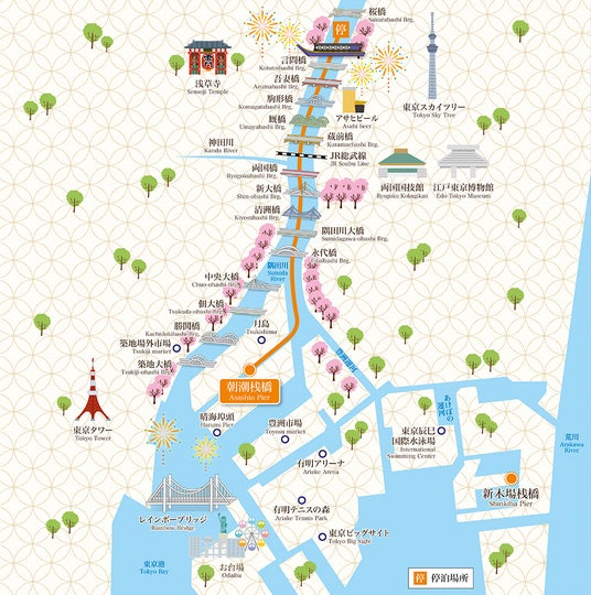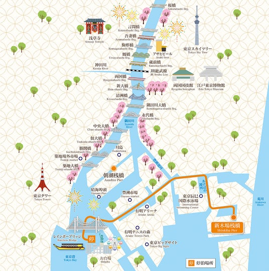 【展望デッキ付】もんじゃ焼き食べ・飲み放題屋形船コースの周遊ルート