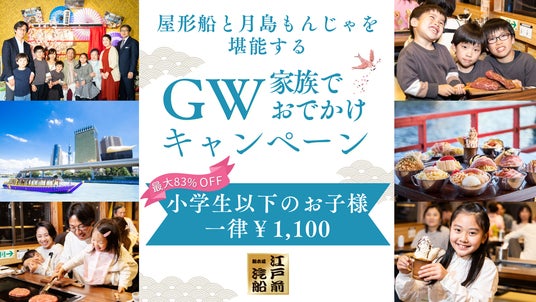 浜友グループの江戸前汽船株式会社(本社:東京都江東区、代表取締役:後藤武彦)はGWの連休でお出かけ予定の3世代・ご家族様を対象に、小学生以下のお子様を対象に最大83%OFFの破格キャンペーンを開催することをお知らせいたします。