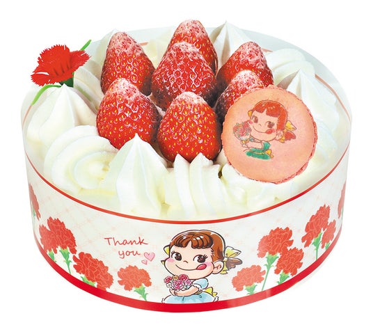 シャンテリークリームに苺、スポンジをあわせた不二家の定番「苺のショートケーキ」が母の日バージョンになって登場! 巻き帯はペコちゃんとカーネーションのかわいいデザインに、また上面にはカーネーションの造花を添えました。苺を華やかに飾ったショートケーキは母の日のお祝いにぴったりです。