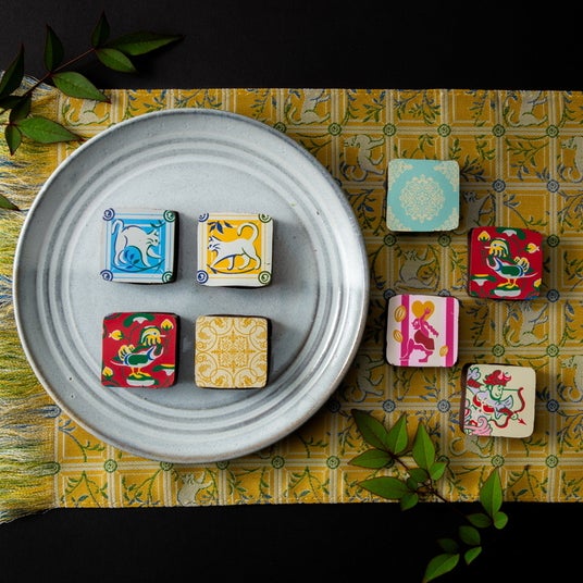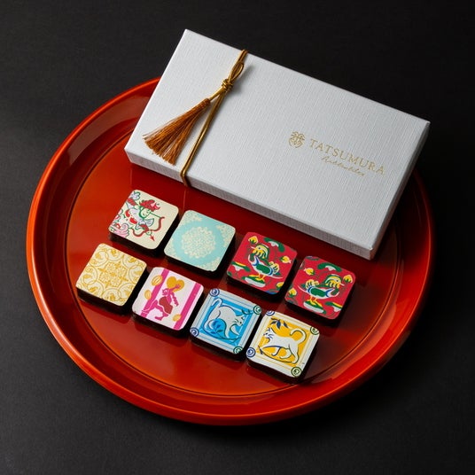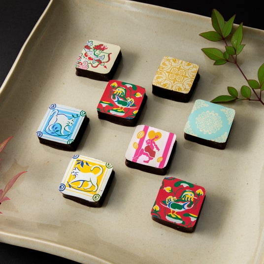永遠の愛、幸運、良縁起など祝祭にふさわしい縁起の良い意味合いを、各柄の象徴的なシンボルと、8種類のフレーバーにて表現しております。チョコレートに描かれた艶やかなデザインをお楽しみ頂くと共に、各フレーバー毎に上品な味わいをご堪能下さい。