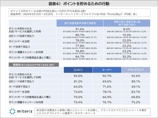 「ポイントを貯めるための行動」を調査したところ「ポイントを貯められるお店・サービスを選択して利用」が「あてはまる(54.6%)」「ややあてはまる(37.0%)」を合わせて91.6%と最も多く、次いで「QRコード決済で支払う(80.7%)」「ポイントデーを活用(78.0%)」と続きました。