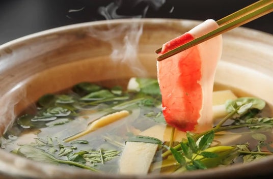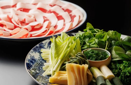 春のぼたん鍋では、根菜類と合わせていた冬ぼたんとは少し違い、山椒の効いた特製出汁とたっぷりのクレソン、筍、芹、三つ葉、うど、木の芽など丹波篠山産の瑞々しい春野菜と合わせてお召し上がり頂きます。