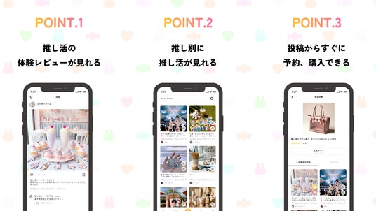 面白いイベントや素敵なグッズに出会った実際の推し活の体験を、他の推し活ユーザーに紹介することができます。リアルな体験レビューを見て、気になったイベントやグッズはアプリ内からすぐに予約、購入ができます。予約、購入した体験のレビューをアプリ内に投稿することで、教え合いの輪を広げていきます。また、マップ上で推し活の体験の場所と内容を知ることができます。