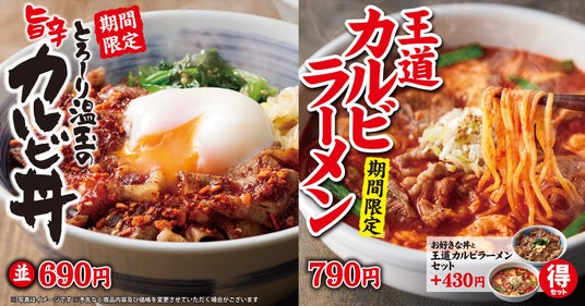 「焼きたてのカルビ丼」は490円(税込)から、「ユッケジャンスープ」は590円(税込)からご用意。またお得なセットメニューもあり、価格も大きな魅力の一つです。