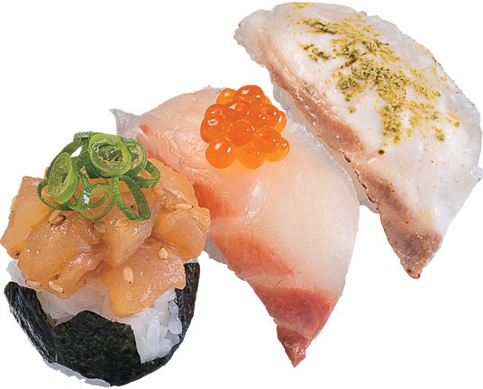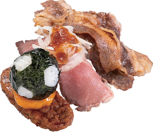 御影 玲王(みかげ れお)の好きな食べ物“石垣牛のイチボ”よりイメージした肉三昧な一皿です。「ローストビーフおろしステーキソース仕立て」「牛カルビ二枚重ね」「月見てりやきハンバーグ寿司サッカーシャリボールのせ」の肉ネタ寿司3種を一皿で楽しめます。豪快でボリューム満点の商品です。