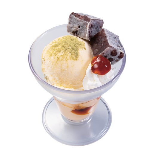 潔 世一(いさぎ よいち)の好きな食べ物“きんつば”や、かっぱ寿司の大人気スイーツ“プレミアムプリン”、ホイップクリーム、バニラアイスなどを盛り合せた、様々な素材と甘味が絶妙なハーモニーを奏でるパフェです。仕上げに和素材の粉末玄米茶をトッピングしました。