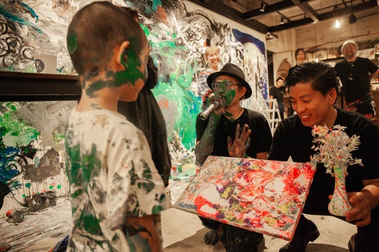 柏原晋平さんの提案で、会場を一番盛り上げてくれた来場者へ絵をプレゼント!なんと受け取ったのは…最後までペンキまみれになりながら描いてくれたモリト君!