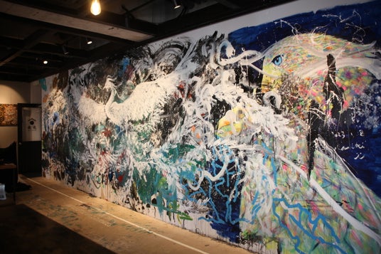 3名のアーティストがひとつの巨大壁画に挑み、迫力は満点。
