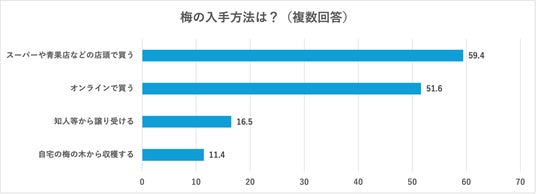 また、生梅の入手方法は、「スーパーや青果店などの店頭で買う」が59.4%、僅差で「オンラインで買う」が51.6%となりました。梅の産地ではない地域にお住まいの方でも確実に生梅を購入するために、オンラインで購入することが増えてきているのかもしれません。「知人等から譲り受ける」が16.5%、「自宅の梅の木から収穫する」が11.4%と、身近なところで梅が入手しやすい環境にある方も意外と多いことが分かりました。