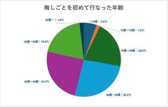 また、梅しごとを初めて行った年齢を聞いたところ、「30~39歳」(26.2%)、「40~49歳」(24.5%)と、30代以上が多いことが分かりました。次いで、「19~29歳」(20.6%)、「50~59歳」(19.6%)と続きます。