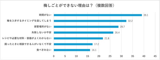 梅しごとをしない人にその理由を聞いたところ、「時間がない」(39.1%)」、「梅を入手するタイミングを逃してしまう」(32.2%)、「保管場所がない」(28.7%)が続き、この他にも