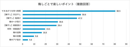 梅しごとで楽しいポイントを聞いたところ、「できあがりを待つ時間」が80.5%と上位になりました。その次に、梅干しの「天日干し」(50.6%)、「塩漬け」(47.2%)と続きます。このアンケートでは梅干しを漬ける方が一番多いので、やはりみなさん梅干しを漬ける過程がお好きなようです。