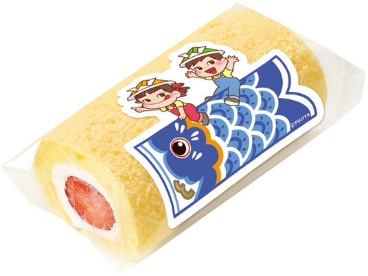 こどもの日らしい2種類のケーキが登場します。チョコスポンジにチョコムース、プリンを重ね、チョコグラサージュでコーティングしたかぶと型のケーキと、シャンテリークリームと苺、シロップ漬けの黄桃ダイスカットをスポンジで巻き、パッケージにこいのぼりとペコちゃんポコちゃんをデザインしたかわいいロールケーキです。