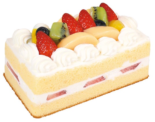 国産苺、ブルーベリー、キウイと、シロップ漬けのマンゴー・白桃を華やかに飾りました。