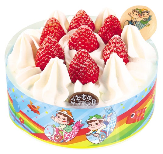 シャンテリークリームとスライス苺をスポンジでサンドし、ペコちゃんポコちゃんがこいのぼりに乗っている楽しいイラストがデザインされた巻き帯で飾った苺のショートケーキです。こどもの日のお祝いにぴったりで、サイズも3種類からお選びいただけます。