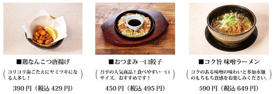 「とりあえず吾平」は1999年11月1日に石川県小松市に第1号店をオープンし、今年で25年目を迎えます。郊外型の居酒屋の先駆けとしてスタートしたとりあえず吾平は、個室感のある客席が人気で、若者からご年配まで、ご家族連れや地域での集まりなど、幅広いお客様層やシチュエーションにてご利用を頂いております。フード、ドリンクのメニューはリーズナブルなお値段で、全メニューの約7割が一品390円(税別)以下でお楽しみいただけます。また、郊外型居酒屋店ならではの特徴として、お車でお越し頂くお客様にも楽しんで頂けるようノンアルコールカクテルやノンアルコールドリンクの品揃えが充実しております。フードメニューも数多い商品を取り揃え、食事のみでのご来店のお客様にも喜んで頂けるメニュー構成となっております。