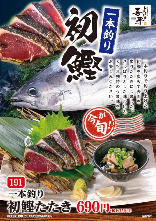 「くつろぎ」の空間を提供し、お食事を楽しんでいただく居酒屋「とりあえず吾平」ではさっぱりした味わいが美味しく、今年初めて水揚げされた独特の風味のカツオの一本釣り「初鰹たたき」を4月24日(水)より期間限定で販売いたします。春から初夏にかけて黒潮にのって、太平洋を北上するカツオは脂身が少なく、さっぱりとした味わいが特徴です。また、表面を炭火で炙りたたきにして上品な薫りに仕上げました。江戸時代中期には、俳人の山口素堂が詠んだ「目には青葉 山ほととぎす 初鰹」にもございます通り「初鰹」は春の風物詩の一つで旬な食べ物として重宝されていました。時代は違えど、日本の春夏秋冬は変わらず「初鰹」は今も春の訪れを告げる国民のソウルフードでございます。この機会に是非ともお召し上がっていただければと思います。皆様のご来店をスタッフ一同お待ちしております。