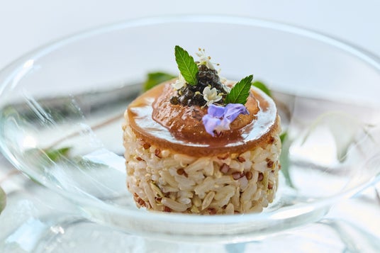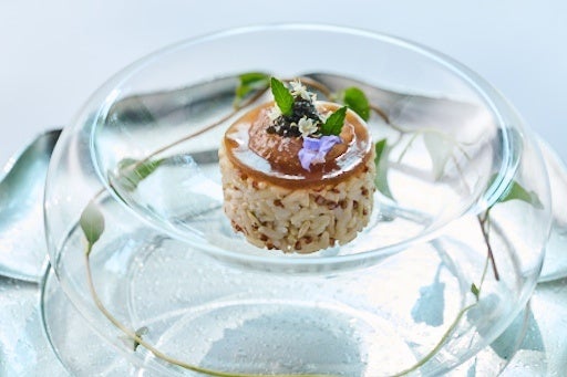 前菜は、玄米とキヌアを使った味わいも見た目も涼しげなサラダ仕立ての一品です。近年ではスーパーフードとして知られるキヌアですが、台湾では古くから原住民族が主食として、またお酒を造る原料として使用している穀類です。キヌアと玄米の他に、玉ねぎやローストしたパンプキンシードと合わせサラダとし、中には滑らかな食感のウニを包み込むことで、外と中の異なる食感を生み出しています。